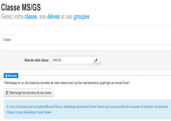 Connectez-vous puis cliquez sur "tableau de bord/mes classes"; cliquez votre classe. Un cadre "nouveau" est disponible avec le lien de téléchargement des données de votre classe. Veillez à bien lire les instructions dans le cadre en dessous du bouton pour exploiter ce fichier.